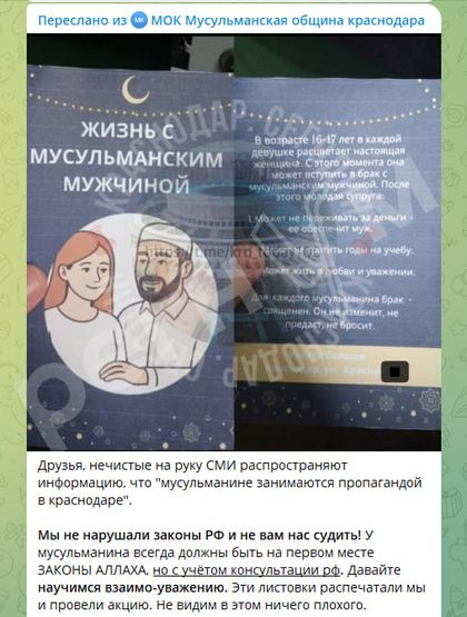 После расследования ИА Регнум мусульманская община Краснодара официально заявила, что не имеет отношения к листовкам с призывами к бракам с несовершеннолетними девочками, распространявшимися по городу.