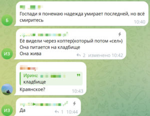 Ещё одна участница сообщества увидела девочку живой, но раненой. По её словам, Валерия выбралась из дома, спустилась по бетонным ступенькам вниз, чтобы укрыться, и там осталась. Она призвала искать тщательно, проверяя каждую щель. Другая практикующая подтвердила, что девочка жива, но боится звуков, прячется, находится в состоянии контузии и будет найдена.