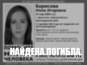 Поисковый отряд «ЛизаАлерт» сообщает о печальном завершении поисков 23-летней Инны Борисовой в Краснодарском крае. Девушка была найдена погибшей. Подробности обстоятельств происшествия на данный момент не разглашаются.