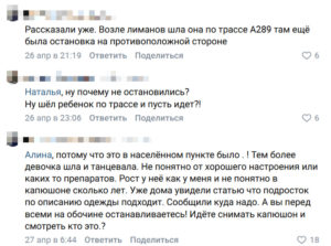 Этот комментарий породил волну осуждения со стороны других участников паблика. Одна из подписчиц прямо спросила, почему никто не остановился, ведь ребёнок шёл по трассе. «Ну шёл ребёнок по трассе — и пусть идёт?!» — возмутилась она. Свидетельница ответила резонным вопросом: останавливается ли каждый перед каждым прохожим в капюшоне, чтобы снимать с него капюшон и проверять возраст и личность? Она подчеркнула, что действовала в рамках населённого пункта, и сразу же передала информацию, как только поняла возможную связь с пропавшей.