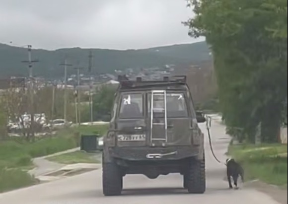 По дороге ехала машина. Рядом бежала собака. Она была на поводке. Второй конец держал пассажир автомобиля. Случившееся сняли на видео.