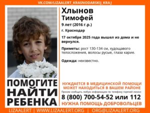 В Краснодаре объявлен в розыск несовершеннолетний Тимофей Хлынов 2016 года рождения. По информации отряда «ЛизаАлерт», подросток покинул место жительства 17 октября 2025 года и до настоящего времени не вернулся.