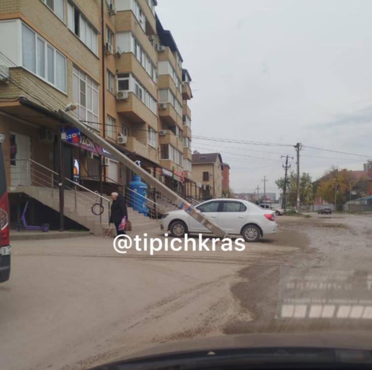В центре Краснодара на улице Шаляпина уже неделю сохраняется потенциально опасная ситуация. Столб, сбитый большегрузным автомобилем, не убран до сих пор. Конструкция не упала окончательно лишь чудом – она повисла на козырьке, нависая над тротуаром.