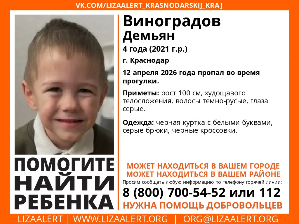 Волонтёры поисково-спасательного отряда «ЛизаАлерт» объявили срочный сбор на поиски ребёнка в Краснодаре. В День космонавтики, 12 апреля 2026 года, во время обычной прогулки исчез Демьян Виноградов, которому всего четыре года. Малыш родился в 2021 году, и с момента его пропажи прошло уже немало времени, эти часы могут быть критически важны.