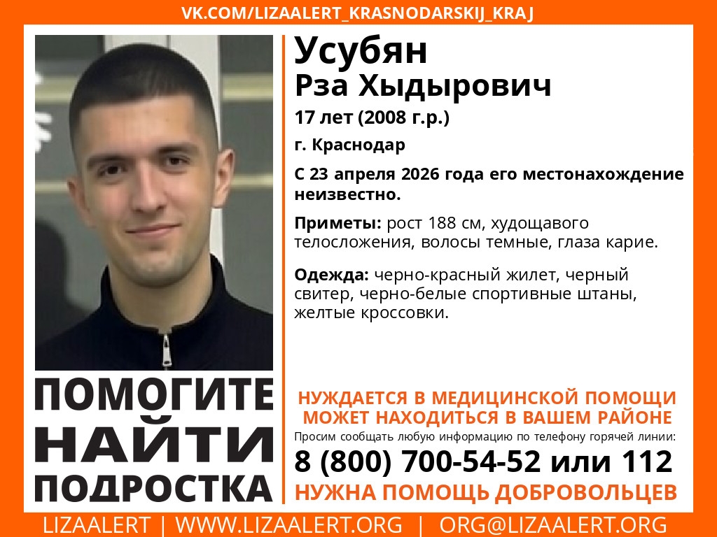 Внимание! В Краснодарском крае разыскивают несовершеннолетнего подростка. Добровольческий поисково-спасательный отряд «ЛизаАлерт» сообщает об исчезновении 17-летнего Рзы Хыдыровича Усубяна, 2008 года рождения. С 23 апреля текущего года о его местонахождении ничего не известно.