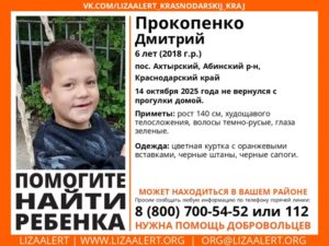 В поселке Ахтырский Абинского района Краснодарского края разыскивается шестилетний Дмитрий Прокопенко. Ребенок пропал днем 14 октября 2025 года, уйдя на прогулку и не вернувшись домой.