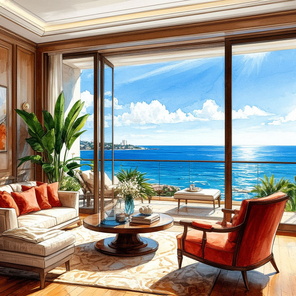 В помещениях выполнена чистовая отделка, оно включает в себя кухню-гостиную, три санузла и лоджию. Высота потолков составляет 3,1 метра. Жилая площадь апартаментов — 194,9 кв. м, площадь кухни — 16,6 кв. м. Особенностью объекта являются панорамные окна с видом на море. Дом сдан в эксплуатацию в третьем квартале 2024 года.