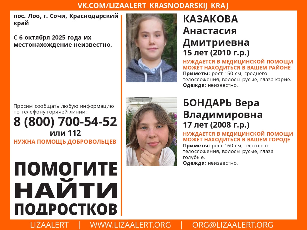 В микрорайоне Лоо города Сочи разыскиваются две девочки-подростка, которые перестали выходить на связь с 6 октября текущего года. Информацию о пропаже распространил поисково-спасательный отряд «ЛизаАлерт».