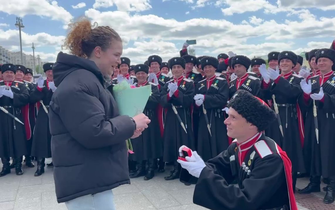 Традиционно праздник запомнился и романтическим моментом. Алексей Чеславлев, представитель казачьей сотни Кубанского государственного технологического университета, сделал предложение своей возлюбленной прямо на Красной площади. Девушка ответила согласием, получив кольцо и букет цветов.