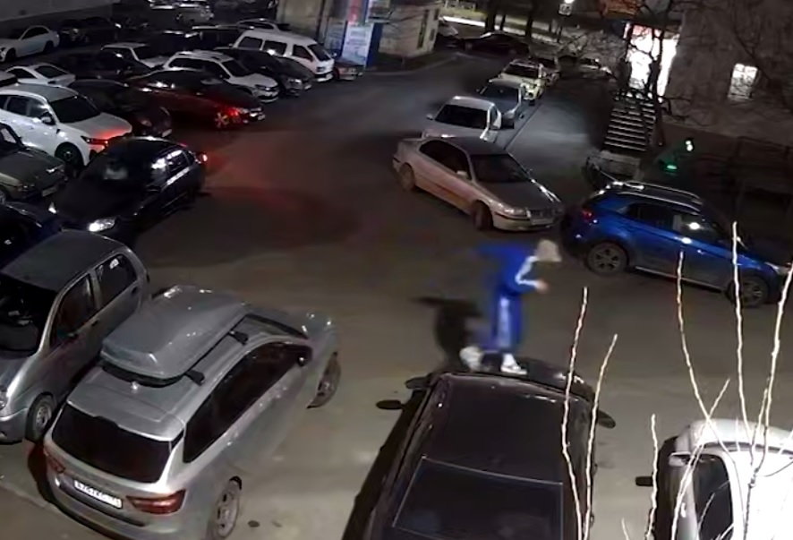 Случившееся было снято на видео. На кадрах видно, как мужчина в синем спортивном костюме бегал по капотам машин.