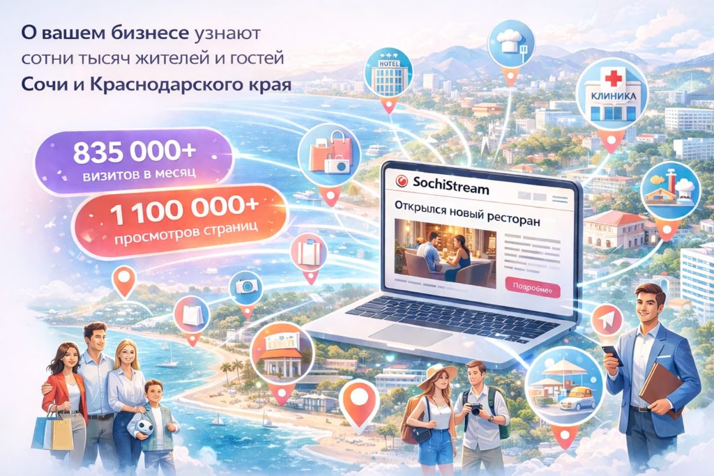 Размещение рекламы на официальном новостном портале SochiStream даст Вам не только поток потенциальных клиентов для Вашего бизнеса, но и повысит медийность, присутствие в медиасфере Вашей компании, продукта, услуги, что значительно повысит доверие аудитории.